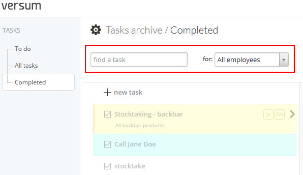 The Versum task archive shows all tasks, both incomplete and completed. You can also search for tasks by the assigned person (all employees, all receptionists, specific employees) or the task name, typing it into the search field.