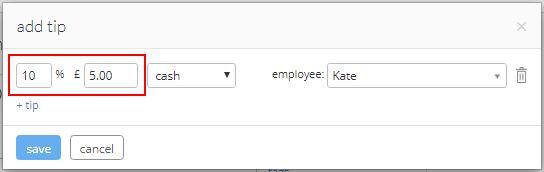- The default tip is 10% of the amount the customer pays (after any optional discounts). You can change the tip value by entering the appropriate amount or percentage: