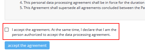 - Under the contents of the agreement, check the option "I accept the agreement. At the same time, I declare that I am the person authorized to accept the data processing agreement. ":