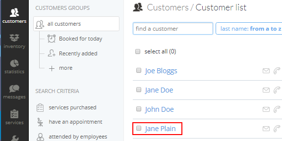 - Find the customer whose record you want to access (you can use the search field on the left)