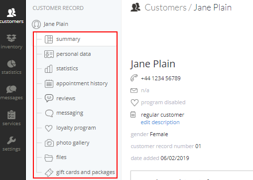 In customer record, you can display all the information about a customer, such as: personal details, appointment history, statistics, reviews, information about the Loyalty Program, photo gallery, attached files and information about gift cards and packages.