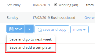 Tip: You can also create templates when creating a work schedule. In such a case, after you've selected the working hours for each day, click the drop-down menu next to the save button and select the save and add a template option: