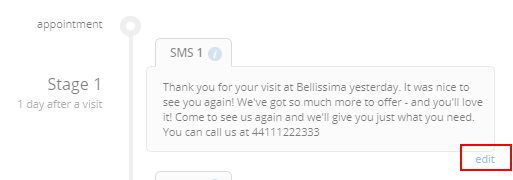 Just create a message and the system will automatically send it for you. Each customer will receive three messages. The first one will be sent one day after a customer's second visit. Two more messages will be sent four and eight weeks after the second appointment, respectively, unless the customer visits you again in the meantime.