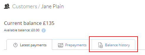 - To access the customer's balance history and see the list of all transactions, click the Balance history tab: