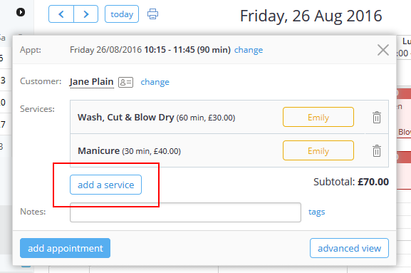Note: If the Resources add-on is enabled, Versum will automatically reserve rooms and appointments assigned to the selected services. - If there are multiple services within one appointment, click add a service: