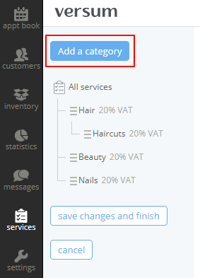 - Select the VAT rate for the category. This will be the default VAT rate for all services added to the category (you will be able to change it manually for a particular service)