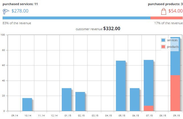 - Below you can see the customer's revenue stats month by month. Revenue from services has been marked in blue, revenue from products has been marked in red:
