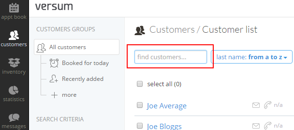 In order to quickly find customers in your customer database in Versum, you can use the global search box, available wherever you are in Versum, at the top of the page: