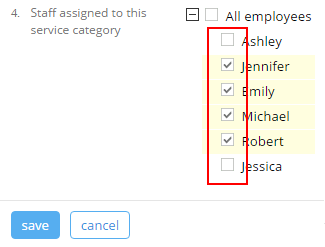 - In order to assign all employees to the service category, select the All employees option in point 4, Staff assigned to this service category. Otherwise, click the + icon to expand the employee list and select required employees: