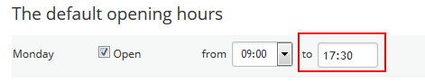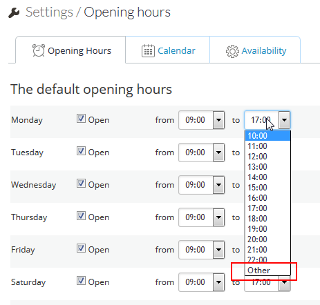 - Click the drop down menu with the closing hour (the "to" field) next to the day you'd like to change the closing time for