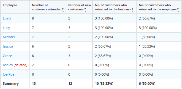 - the number of customers who returned to the employee: The number and percentage value of customers who were attended by a given employee during their first appointment and returned for another appointment with the same employee.
