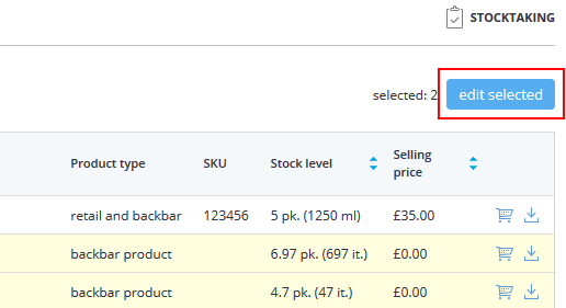 Tip: By selecting the top check box, next to the Name column heading, you select all products on the list. You can also select a product category from the menu on the left, and then select particular or all products from that category.