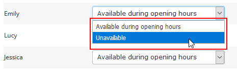 However, if the working hours of some staff members are different, you can set their availability to "unavailable". You will still be able to overwrite it by scheduling breaks, leaves and other absences.