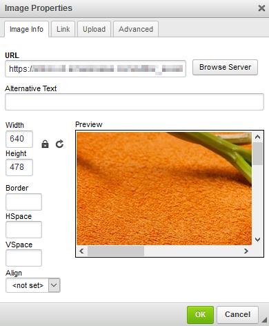 - Once you've selected an image, it will be shown in the image properties window. You will be able to enter Alternative Text (shown if the image itself is blocked), image dimensions, alignment etc. To insert a link, go to the Link tab. Once you're done, click OK to insert the image to the message: