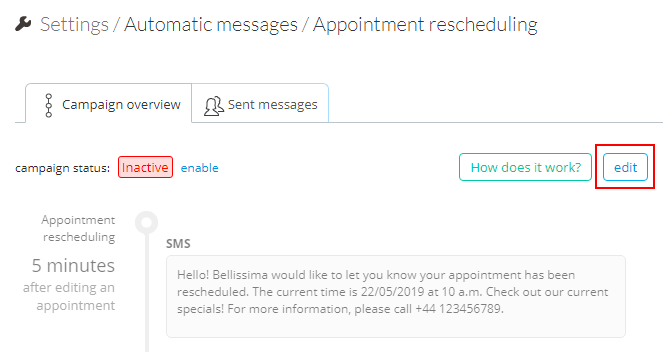 Enable this feature to send customers automatic rescheduling notification containing new date and time of the appointment. The message is sent 5 minutes after the last update of the appointments.