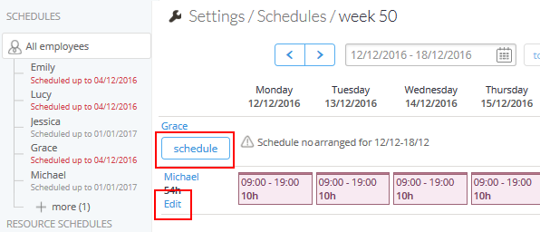 - Click Edit below the employee's name (or the schedule button if the schedule has not been created yet):